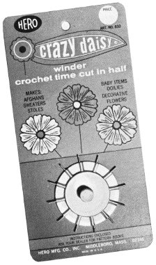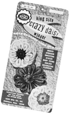 MATERIALS: HERO Crazy Daisy Winder and King Size Crazy Daisy Winder. Sport Yarn, 2 oz. pull skein, 4 (5) Royal Blue (A) and 4 (5) White (B). HERO No. 1 steel crochet hook and tapestry needle.