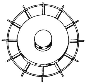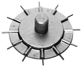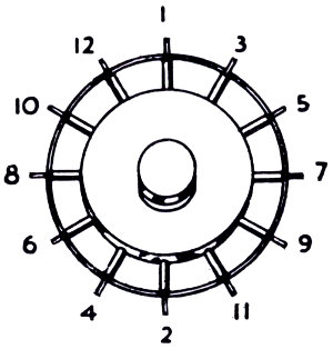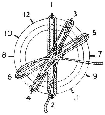 B: Turn winder over with knob underneath and flat side with spokes extended facing you. Hold winder in left hand. With left thumb hold yarn at center leaving end to extend about 1″; with right hand, pass yarn from left to right around spoke No. 1; then across center from right to left around spoke No. 2 directly opposite. Wrap around these 2 spokes once more in the same manner, or as many times as desired (the number of wraps depends upon the thickness of the yarn you will be using). Bring yarn across center and wind from left to right around spoke No. 3; then across center from right to left around spoke No. 4. Wrap around these 2 spokes once more, or as many times as you wrapped around spoke 1 and 2. Bring yarn across center and wind from left to right around spoke No. 5; then across center and from right to left around spoke No. 6. Wrap around these 2 spokes once more or as many times as you wrapped around spoke 1 and 2. Continue in this manner to wrap yarn around 2 spokes directly opposite each other and then passing onto the next 2 spokes until all spokes are wrapped, ending with spoke No. 12. Bring yarn across center and cut leaving 1″ extended beyond center (see illustration B). Do not remove from winder.