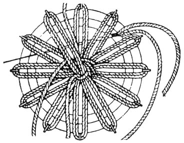 C: Center: Thread tapestry needle with yarn. The side facing you will be the wrong side of the daisy. Fasten at center of wrong side as for embroidery. Insert needle under 4 petals and draw yarn through; bring yarn back over last 3 of the 4 petals; insert needle under these 3 petals plus 1 more, making 4 petals in all; draw yarn through. Continue in this manner to bring yarn back 3 petals and then draw it under 4 petals each time until you have made 13 sts. Be sure to have 13 sts or center will be incomplete. As the center sts are worked, weave around the starting end of daisy for a few sts to fasten it securely. Fasten on wrong side. Cut ends (see illustration C). Turn knob to draw in spokes and release daisy.
