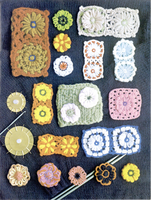 Shown are several types of daisies and joinings used in making the garments in this book. Also shown are some suggestions for variations that can be made with the Hero “Crazy Daisy” Winder and the Hero King Size “Crazy Daisy” Winder.