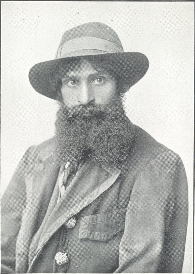 Many kinds of foreigner tread the streets of Liverpool, and thus, when Uncle Kola and his tribe appeared on the banks of the Mersey from nowhere in particular the little boys put him down as a new species of “Dago,” and did not embarrass him with unwelcome attention. Yet Kola is an extraordinary man, and even his costume is conspicuous. His trousers, superfluously baggy and decorated with wide stripes of bright green and red, are thrust into great top-boots elaborately stitched. The complicated braiding of his dark blue coat and waistcoat would be remarkable were it not eclipsed by the glory of his enormous buttons, splendid examples of the silversmith’s craft. Kola is tall and powerfully built, and he wears his finery with effect, supporting himself by a five-foot staff almost covered with silver, on which shine countless little images of Buddha. p. 8His keen eye, aquiline nose, strong mouth, and venerable beard tinged with grey make derision impossible; and he walked our thoroughfares with dignity, slowly, gravely scrutinizing the town as if it owed him money.