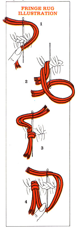 FRINGE: Work over each ch 1 space according to illustrations #1, #2, #3 and #4 on page 18. Work in colors according to chart at right. Thread a double strand of yarn into a tapestry needle. Starting in 1st ch 1 space in lower left corner work according to illustration #1. Continue according to steps #2 and #3 to complete 1 fringe. Start at #4 for next fringe and work #2 and #3. Always start with illustration #1 when changing colors.