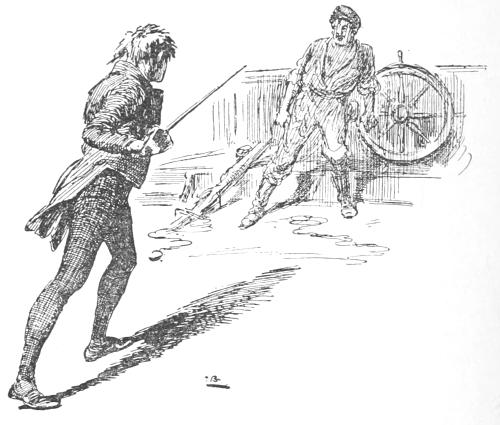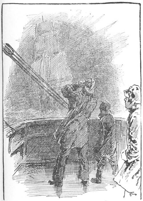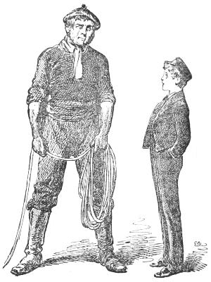 All too young as I was to be an observer, I could yet see a spirit of laughing mischief flash into the lad’s brown handsome face, and I have no doubt that he would have told me to go forward and seek for the cook and report myself, or have started me on some other fool’s errand of a like sort, but for a sunburnt man in a blue-cloth coat[16] coming up to us, and asking my father what he wanted; on which the midshipman slunk away and joined two other midshipmen, who, on his speaking to them, began to shake with laughter.