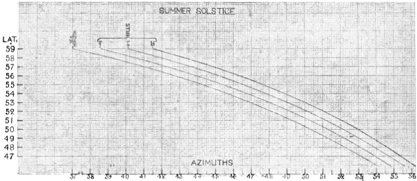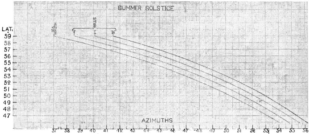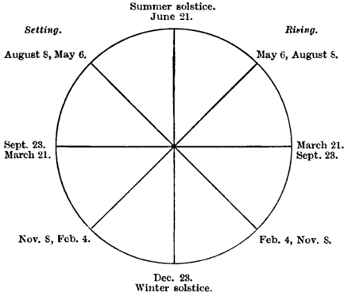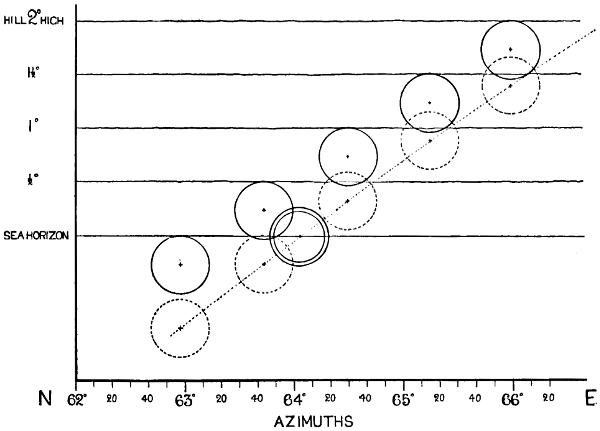 Reference to the May-Sun curve, given on p. 263, indicates that this is probably an alignment to the sunrise on May morning. Therefore, in determining the zenith distance, the correction for the sun’s semi-diameter (16′) must be taken into account, allowing that 2′ of the sun’s disc was above the horizon when the observation was made.