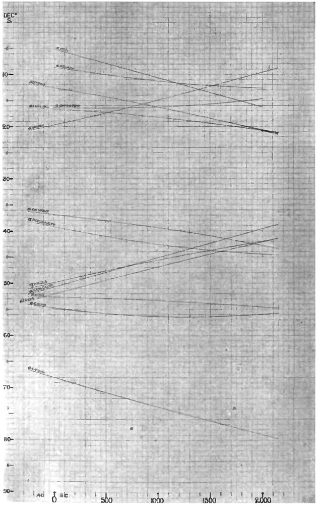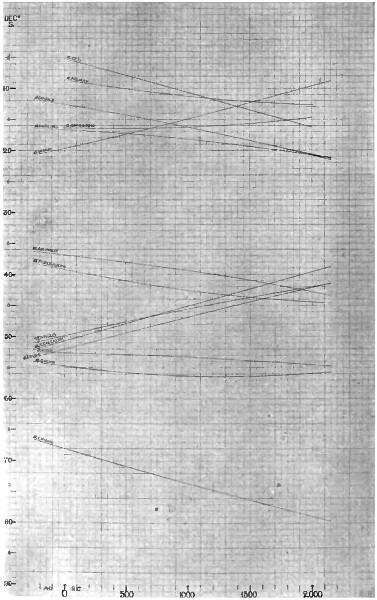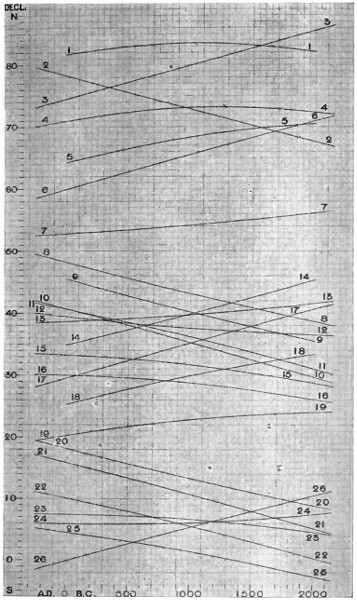 This gives us a declination of 42° 33′ N., and a reference to the stellar-declination curves (p. 115-6) shows that Arcturus had that declination in 2330 B.C. From the table given on p. 117, we see that at that epoch Arcturus acted as warning-star for the August sun.