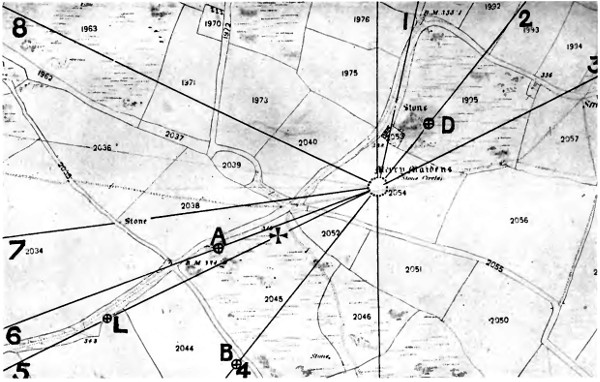 In such cases the azimuth of some object that is marked on the map should be taken as a reference line and the difference of azimuth between that and the unmarked objects determined. By this means the azimuths of all the sight-lines may be obtained.