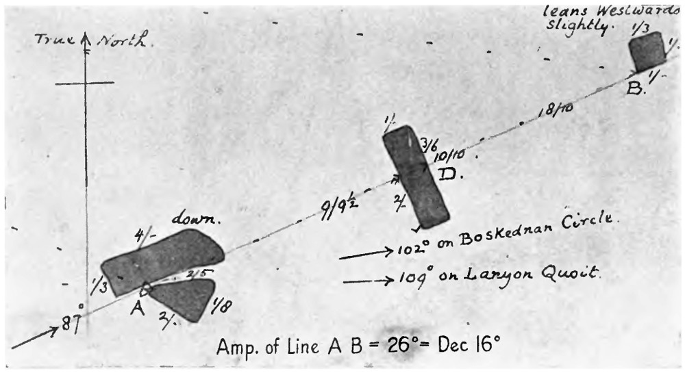 Reference to the Nautical Almanac shows that this is the sun’s declination on May 5 and August 9. We may therefore conclude that the Long-stone was erected to mark the May sunrise, as seen from the Tregeseal Circle.
