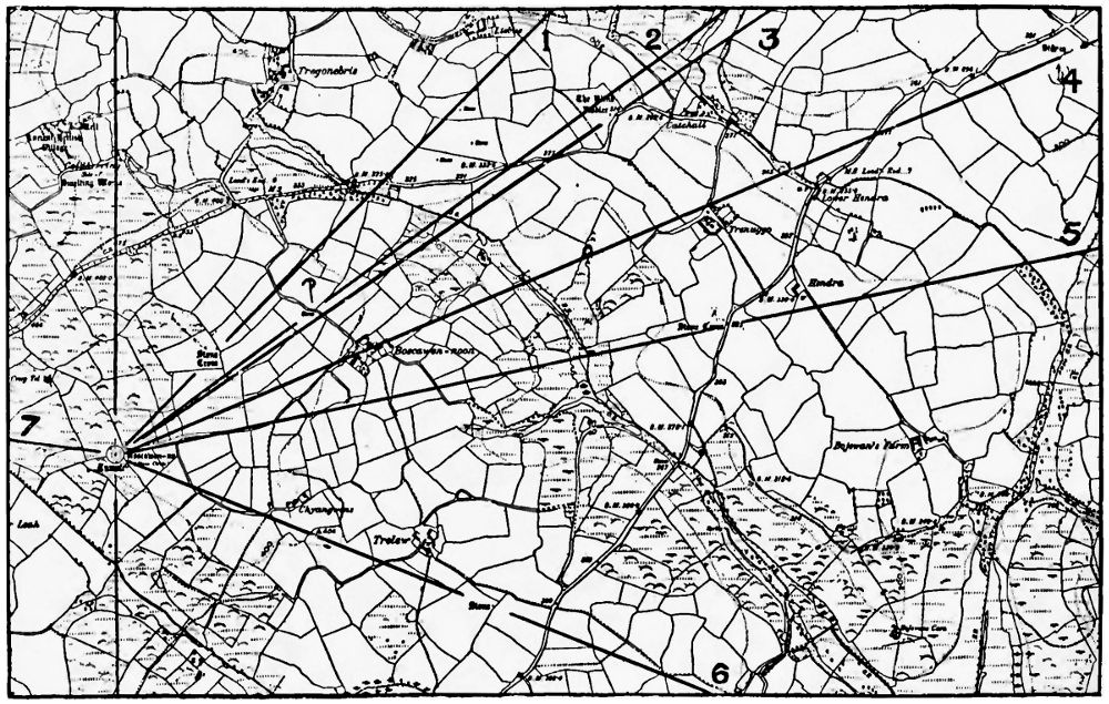 When using the 25-inch maps for determining azimuths it must be borne in mind that the side-lines are not, necessarily, due north and south. The Director-General of the Ordnance Survey, Southampton, will probably on application state the correction to be applied to the azimuths on this account, and this should be applied, of course, to each of the values obtained.