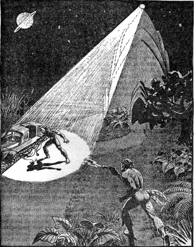The voices became inaudible then as the men passed on. Simms stood in his tracks undecidedly. Then a glimmer of flare lightning in the sodden sky illuminated that strange tower just ahead. Like a magnet it drew him forward with its power.