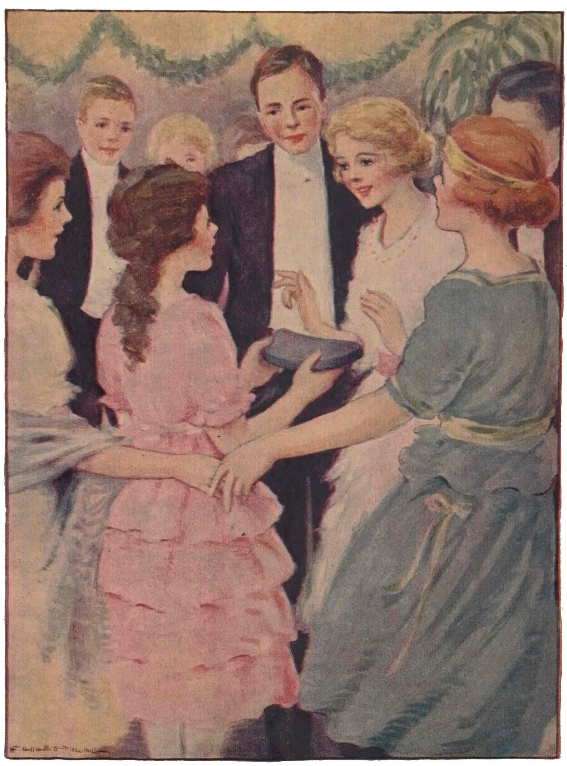 Trudie wondered why they seemed to be the only couple dancing, and she was still more puzzled when Arthur waltzed to the middle of the room and then paused. Before she had time to question this strange procedure, from every part of the room came laughing girls. Running toward her and catching hold of hands, they formed a circle about her as gaily they sang: