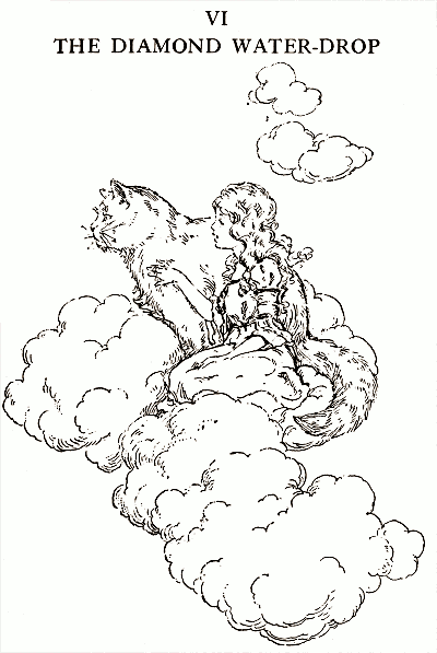 “One of you will have to go down to the kingdom of the Gnomes, in the center of the earth, to find out where the Golden Ivy-seed is,” replied the cat “and up to the kingdom of the Air-Spirits, above the clouds, to find out where the Diamond Water-drop is.”