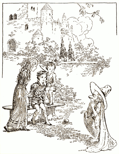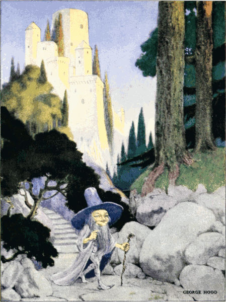 The garden was on the opposite side of the palace to the forest, and was full of flowers, and birds, and fountains, in the basins of which gold-fishes swam. In the center of the garden, was a broad green lawn for the children to play on; and on the further edge of this lawn was a high hedge, with only one round opening in the middle of it. But through this opening no one was allowed to pass; for the land on the other side belonged to a dwarf, whose name was Rumpty-Dudget, and whose only pleasure was in doing mischief. He was an ugly little dwarf, about as high as your knee, and all gray from head to foot. He had a gray beard and wore a broad-brimmed gray hat, and a gray cloak, that 6was so much too long for him that it dragged on the ground as he walked; and on his back was a small gray hump, that made him look even shorter than he was. He lived in a gray tower, whose battlements could be seen from the palace windows. In this tower was a room with a thousand and one corners in it. In each of these corners stood a little child, with its face to the wall, and its hands behind its back. They were children that Rumpty-Dudget had caught trespassing on his grounds, and had carried off with him to his tower. In this way he had filled up one corner after another, until only one corner was left unfilled; and if he could catch a child to put in that corner, then Rumpty-Dudget would become master of the whole country, and the beautiful palace would disappear, and the lovely garden would be changed into a desert, covered over with gray stones and brambles. You may be sure, therefore, that Rumpty-Dudget tried very hard to get hold of a child to put in the thousand and first corner; but all the mothers 7were so careful, and all the children so obedient, that for a long time that thousand and first corner had remained empty.