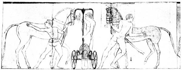 It was the major-domo of the Bishop of Corneto, Vittorio Masi, who first opened them together with other tombs in the vicinity of Corneto. In the spring of 1827 he invited two German barons, Stackelberg, an able archaeologist, and Kestner, the Hanoverian ambassador in Rome, to inspect them, and, if they so desired, to survey, draw, and publish the pictures in the tombs. The two men arrived, accompanied by Thürmer, a Bavarian architect, to find the tombs themselves despoiled of their accessories, but the walls covered with wonderful pictures dating from the sixth and fifth centuries B.C. They set to work immediately, studying and copying the pictures in the richest of the tombs, the Tomba delle Bighe. Stackelberg made five charming water-colours in order to save the colouring for posterity; Thürmer executed eleven careful drawings. In all, the two men painted and drew two hundred and twenty-five figures, and the whole of the material is now preserved in the Archaeological2 Seminar of the University of Strasburg. In his diary Stackelberg gives a vivid description of the discomfort which they experienced, drawing by torchlight in the cold, dank tomb-chamber, and only emerging now and then into the warm Italian spring sunlight in order to recuperate or to enjoy a light repast on the top of the tumulus, commanding a view of the sea. To this were added fatiguing social duties; local patriotism was aroused in Corneto; the noble families in the town vied in displaying hospitality to the Germans, and big banquets were held, at which sonnets were recited to the ‘heroes’ who once slept in the tombs. The drawing and copying of the colours on the walls in the Tomb of the Chariots, as well as in the Tomb of the Inscriptions and in the Tomb of the Baron—so called after Baron Kestner—were rightly considered the chief matter, because in the very first summer after they were opened, the dampness of the tombs in a few weeks ruined large portions of them, especially in the Tomba delle Bighe. After his return to Rome, Baron Stackelberg caught typhoid fever and did not recover till late in the winter. In the next spring he went to Germany, where his excavations had created such an immense sensation that even the aged Goethe asked Stackelberg to dine with him in Weimar and studied the drawings with the greatest interest. But, in spite of the national enthusiasm called forth by the excavations, the projected great work came to nothing; the coloured plates of the paintings, with the then existing means of reproduction, promised to be so expensive that the publishers took alarm. Pending these negotiations, the paintings from the three tombs were published in French and Italian works in very poor and incorrect reproductions, and no other reproductions were available till 1916, when the German archaeologist, Weege, at last managed to bring out an admirable publication of the Tomba delle Bighe, the most important of the three tombs.1