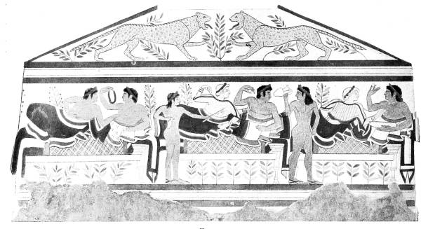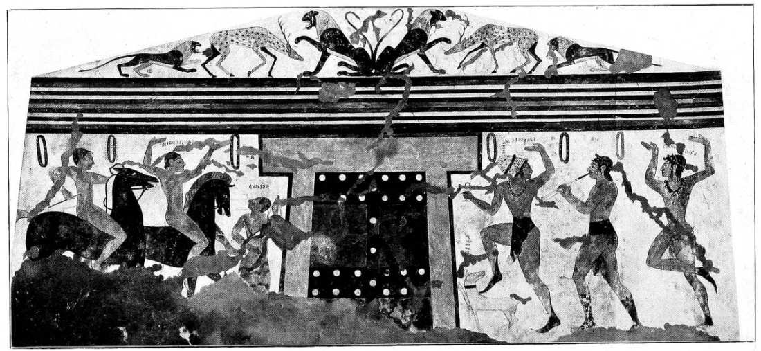 A considerable group of Etruscan tomb-paintings, dating from the middle of the sixth century, show in their composition close connexion with Ionic vase-painting, especially with the so-called Caeretan hydriae, while their main pictures tell us something about the Etruscans themselves and their conceptions of Life and Death and Eternity. Only in the animal friezes beneath the painted roof-supports does the old decorative conception of the human and animal figure still linger; elsewhere the pictures now have content and meaning.