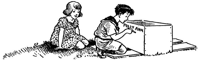 When Janey came out with a tiny basket of lunch Johnny had marked “Polly Ann” on both sides of the box. He had fastened the sail made from the old sheet to a stick and run a string through a screw-eye, so that the sail could be raised or lowered whenever they might wish.