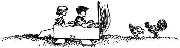 The Polly Ann shot up over the fence, suddenly, scattering the startled chickens in all directions, and as Johnny and Janey crouched low in the box the familiar objects about the farm whizzed by them like bullets.