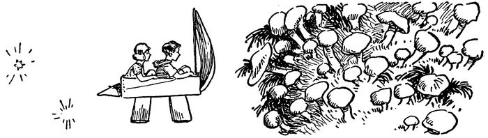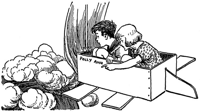 “All right, then, Sis! Put the lunch on one of the sails. No!” and Johnny hammered a nail on one side of the box, “hang the basket of lunch there and climb in. It’s 14going to be a tight squeeze for both of us. But it won’t take this Flying Machine long to get to Mars or Venus or the Moon, and we can get out and rest on some of the Stars if we get tired.”