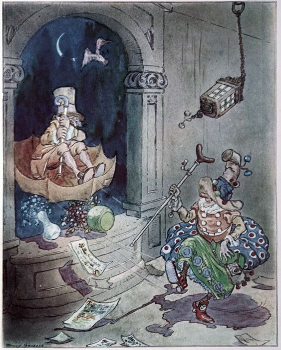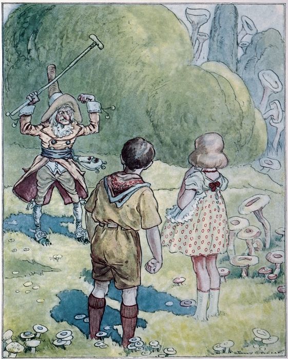 But although he dodged and gave ground Gran’pa waited for an opening and at last, as the Magician missed a swing at Gran’pa’s head, Gran’pa drew his cane back over his shoulder and brought it down with all his might upon old Jingles’ crown.