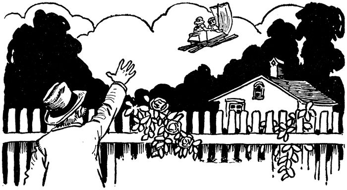 Johnny brought the Flying Machine to a stop directly over Gran’ma and Gran’pa and the neighbors, and they could hear Gran’pa calling to them quite distinctly. The children called back at the top of their voices, but they couldn’t make Gran’ma and Gran’pa hear.
