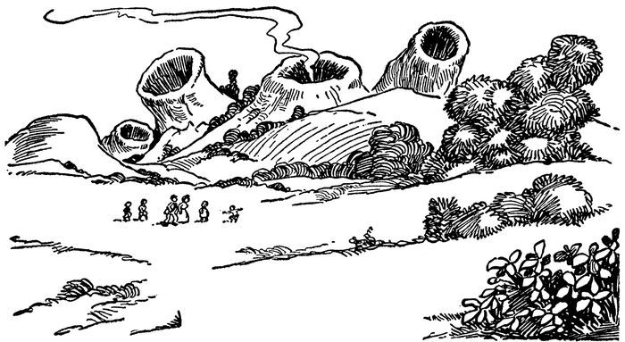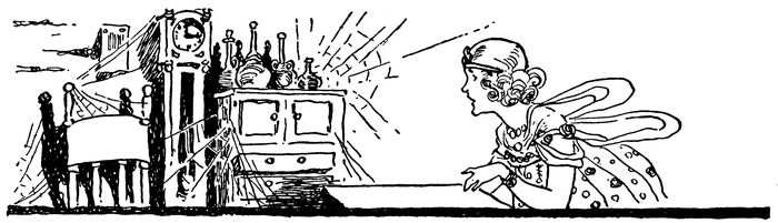 When the Flying Boat was out of sight of the City of Nite, Gran’pa pressed the speed button and the new craft shot through the air like a comet, passing over the mountains and valleys in a flash. In a very few moments it had covered a distance that had taken the travelers long hours to walk.