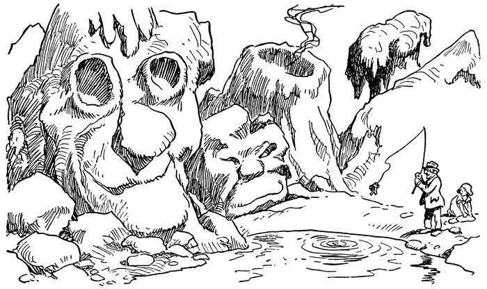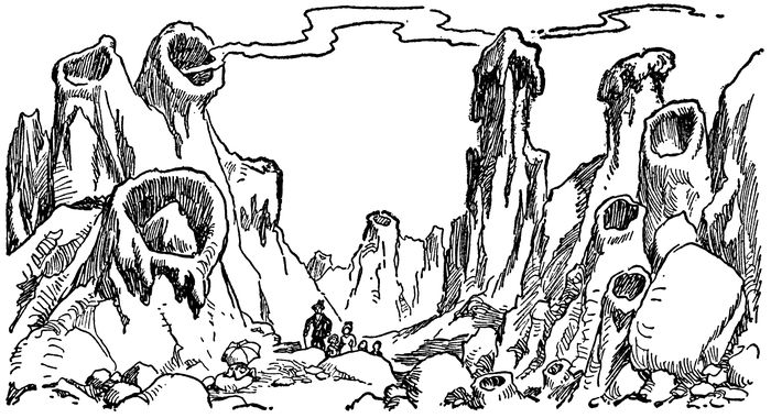 The Moon, seen from where the children viewed it, was of a pale bluish-greenish tint, except where the rays of the Sun slanted across the mountain peaks and into the deep valleys. It seemed to Johnny and Janey as though they were looking through beautiful blue-green glass down into a dark well; for wherever the Sun did not shine or was not reflected from the mountains into the valleys the Moon’s surface was black—so black that it made the rest of the Moon seem transparent. This seemed to the children very strange.
