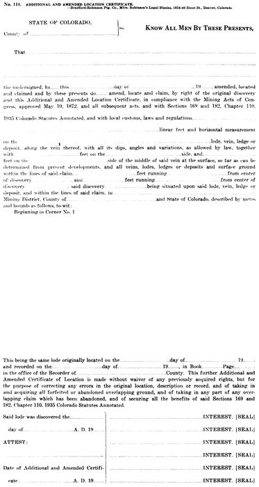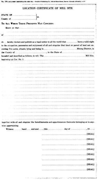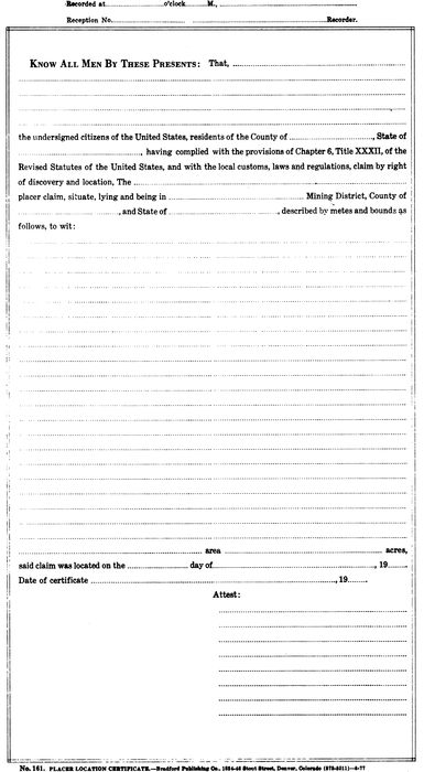 Mining districts may still be formed but any regulations that they may impose cannot be in conflict with existing law at any level of government. At this writing, none are known to exist; however, many location certificate forms call for a mining district, as well as the various forms provided by the Bureau of Land Management for the processing of mineral surveys and patents.