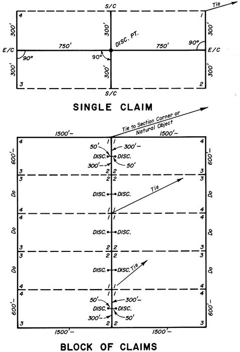 1–1 When gold was discovered at Sutter’s Mill in California in 1849 no provisions had been made by the Congress of the United States for the disposition of minerals on the public domain of the West. After a feeble attempt at leasing, the copper and iron deposits of the Great Lakes region as well as the lead deposits of Missouri were sold outright to the highest bidder with minimum prices set from $2.50 to $5.00 per acre. Consequently, the prospectors and miners of California formed mining districts to provide self-government and maintain law and order. These districts could be as small as a square mile, while others covered an area several townships in size.