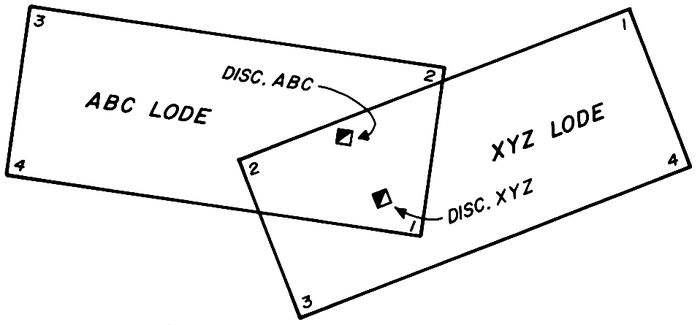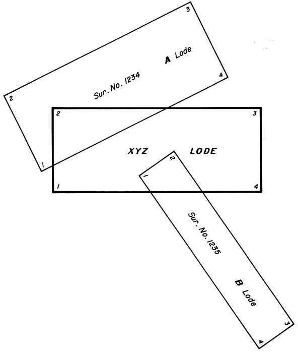 In situation B, Corners Nos. 1 and 2 can be recovered. Lines 4–1 and 2–3 should be shown at the record distance, regardless of the length of line 1–2. The bearings of lines 4–1 and 2–3 may be the record bearing or at the same variation from the record as line 1–2. If this was a rectangular claim, then the bearing of the missing lines probably should be at right angles to line 1–2, unless this would give a distorted relationship between the claim and the workings on it, particularly the discovery. Line 3–4 should be shown parallel and of equal length to line 1–2.