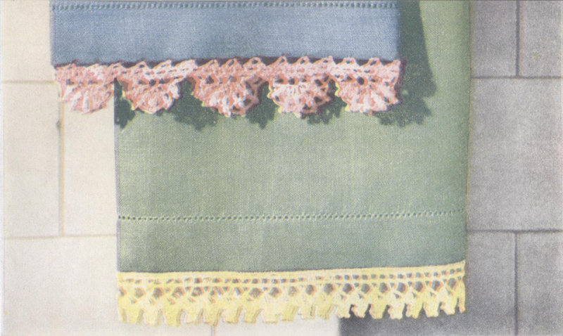 NAPKINS: Cut linen 12 x 12 inches. Turn under a very narrow hem and sew. With Nile Green work a row of s c around entire napkin working 5 s c in each corner, join, cut thread. Attach Shaded Pinks at corner, ch 3, d c in same space, ch 3, sl st in top of last d c for picot, d c in same space, * ch 3, skip 2 s c, s c in next s c, ch 3, skip 2 s c, 2 d c in next s c, ch 3, sl st in top of last d c for picot, d c in same space, repeat from * all around working the 2 d c, picot, 1 d c at each corner and ending row to correspond, join, cut thread. Work a rose same as on mat and applique to corner as illustrated.