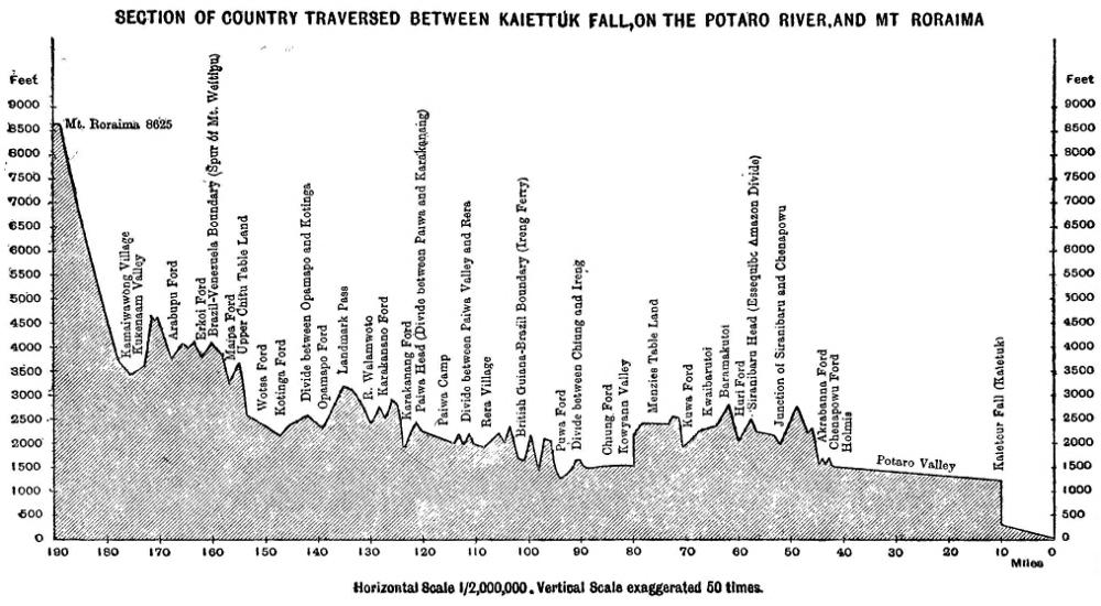 Two long years my husband and I lived continuously[14] in Georgetown, at the mouth of the Demerara River. Then, exhausted in mind and body by the enervating atmosphere and dismal monotony of a tropical coast, near the equator and below sea-level, we decided to spend a brief holiday in exploring a part of the Colony’s interior hitherto blank upon the map, hoping to find there some of that strength which cometh from the hills. A journey up cataract-barred rivers and through primeval forests by Indian trails was in itself an attractive prospect; but we had a still more potent lure. On the 21st March, 1914, my husband had spent a day at the Kaietuk Fall, and had gazed from the brink of the great chasm into which the Potaro River there plunges, up its dreamy reaches towards the forest-clad ridges that stand above the Arnik creek and away to the towering, cliff-faced mass of Mount Kowatipu. It was then that he resolved to visit some day the wonders which Nature might hold in the forests and savannahs farther to the west and the south-west, and perhaps even to make his way to that famous Mount Roraima, of which the residents in British Guiana hear so much and see so little. Then, in October, 1915, he made the acquaintance of Mr. J. C. Menzies, whose[15] occupation as a diamond and gold prospector had carried him into distant parts of our Colony’s interior. Mr. Menzies’ account of prairie tablelands at high altitudes, to be reached by travelling a few days beyond Kaietuk, and affording a view of Mount Roraima, where the boundaries of British Guiana, Brazil, and Venezuela meet, and whence streams flow to the Amazon, Orinoco, and Essequebo, determined us to attempt the journey across those tablelands to that mountain of mystery. During the previous seven years Mr. Menzies had frequently traversed the little-known and unsurveyed part of the Colony that lies between the Potaro River and our frontier with Brazil, and he had been greatly struck by the opportunities for cattle-ranching afforded on its highland savannahs. He had, moreover, bought and driven cattle from Brazil over the Ireng River into British territory, where they wander freely under the nominal guardianship of a tribe of Makusi Indians. He was therefore well qualified to make the preliminary arrangements for the expedition which we had in mind, and he very kindly agreed to place his experience unreservedly at our disposal and to accompany us. His knowledge of our proposed route did[16] not extend beyond the Colony’s boundaries; but he felt sure that an Indian guide could be found in one of the villages near the Ireng, who would be able to lead us on to the goal of our hopes, Mount Roraima.