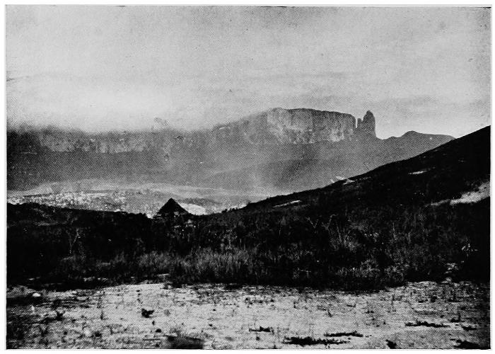 Amatuk is the gateway to the beautiful Kaietuk Gorge. Looking upstream from the bay below the fall, we saw towering on one side the peak of Kenaima Mountain, and on the other side the vertical cliff-face of Mount Kukui. Just above Amatuk the Potaro emerges from between these mountains, and is at once joined from the right by the Amuk creek, which also flows in a narrow gorge, so blocked by huge boulders and so difficult of access that it has never yet been explored. Streams, which are almost better spoken of as cascades, spring down the faces of the cliffs, gleaming like white threads against the red sandstone. Another hint is thus given of the Roraima leit-motif which rules the land. We had, indeed, throughout our wanderings the impression of a mighty symphony. The wondrous Kaietuk Fall was the first movement whose introduction began with Amatuk. Thereafter we[63] realized that several days of river and forest journey were but the transition passages to a movement of shining tablelands, whose jasper-bedded rivers repeat everywhere the same leit-motif, though with a myriad tiny variations, for all the streams of the highland savannahs tumble in cascades down vertical faces into a succession of pools, while long-sought-for and much-dreamt-of Roraima, with his cliffs over a thousand feet in height rising out of primeval forest, standing on his pedestal of rolling savannah uplands, with waterfalls leaping from his mysterious flat-topped summit, forms a magnificent résumé and finale of the whole.