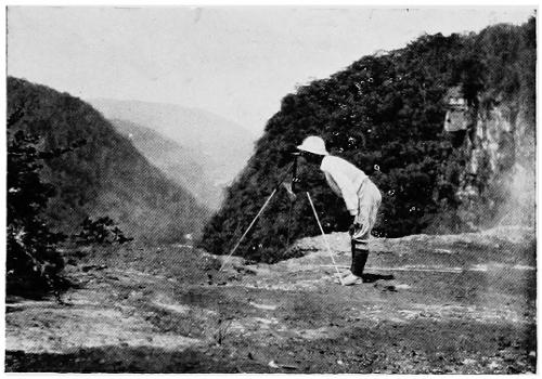 There were showers at dawn, but these had passed over when we started from Tukeit in the early morning to climb up on to the Kaietuk plateau. The existing forest trail, after leaving Tukeit, traverses some low foot-hills, and then rises sharply to cross the Washibaru creek. Next follows another steep ascent to the Korumê creek, which is bridged by tacoubas at a point whose Indian name has been translated as the “Devil’s Mother’s Pillars.” Here the country is very broken, and the whole channel of the Korumê has been strewn with large boulders that completely hide the water from sight. It would seem probable that in time past cliffs stood on both sides of this gorge, and that they crumbled inwards, so blocking the exit of the Korumê, which, nevertheless, has burrowed a way underneath the rocks and hurries down in a very abrupt[72] cataract to the Potaro. From the Devil’s Mother’s Pillars there is an exceedingly steep climb, with a gradient resembling in places a ladder rather than a road, until the edge of the Kaietuk plateau is reached at a tree on which the word “Amen” has been cut. Gossip has it that on one occasion a respected colonist was hoisted up to this point, two Indians pulling him with a rope in front and two more pushing him behind. He lay down under this tree almost at his last gasp; and, while he recovered breath, his companion cut the word “Amen” in the trunk. It certainly is a villainous climb, especially in rainy weather, when the moss-covered stepping-stones are wet and slippery, and it does not improve with acquaintance. From Amen Point the forest trail runs along a ridge more or less level for another couple of miles or so to the Kaietuk savannah, with the precipitous gorge of the Potaro on one side and the deep-cut valley of the Korumê on the other. The Indians say that this path originated in a track by which otters descended from the Upper to the Lower Potaro; and, whether this be so or not, the line is certainly quite unsuitable for human traffic even on foot.