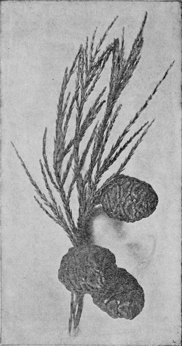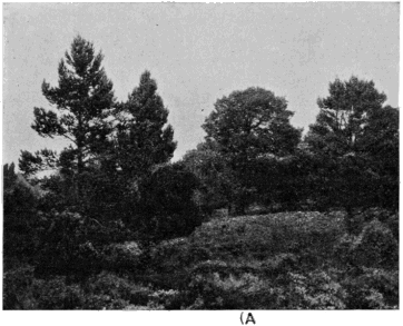 The Scots pine shares with the oak, the beech, the aspen, the yew, and several other trees the right to be included in the native flora of Britain. In the peat-beds of Scotland even up to 3000 feet above sea-level the stumps of pines occur in abundance, and in many places recent researches have revealed the occurrence of successive forests of pines, oaks, and spruces separated from one another by the accumulations of swampy vegetation(9). The spruce fir has long ceased to be a member of the British flora, but in a few localities in the Scottish Highlands patches of primeval pine forests remain. The « 13 » accompanying photograph (Fig. 1), taken by my friend Mr A. G. Tansley, in the Black Wood of Rannoch in north-west Perthshire, shows a few trees of Pinus sylvestris growing in their native soil: the form of the older tree (A) suggests comparison with that of a well-grown beech such as we are familiar with in English plantations. This spreading dome-shaped habit seems to be a peculiarity of the Highland tree, and is one of the characters which have led some botanists to regard it as a variety (Pinus sylvestris var. scotica) of the ordinary Scots pine. Though it is doubtful if any relics of primeval pine woods are left in England, abundant evidence of the former existence of the Scots pine is afforded by the submerged forests exposed at low-tide on many parts of the English and Welsh coasts and at the base of some of the English peat moors. During the construction of the Barry docks on the north coast of the Bristol Channel a few years ago, the exposed sections of peat and forest beds were investigated by Dr Strahan and by Mr Clement Reid. There is evidence of a subsidence of the land to an extent of 55 feet since the formation of the lower peat-beds containing oak, hazel, willow, and other trees. The pine, unknown in Wales during the historic period, was recognised in the Barry cutting. The occurrence of a polished flint implement assigns a date to the uppermost portion of this old land-surface(10).