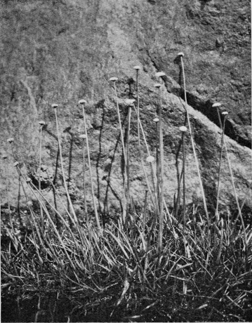 The plant represented in (Fig. 2) is another British species which tasks the ingenuity of students of plant-geography. This is the Pipe Wort (Eriocaulon septangulare), the sole representative in Europe of a certain family of Monocotyledons: it flourishes in the west of Ireland and in the western islands of Scotland but nowhere else in Europe; it is native on the other side of the Atlantic in Canada and the northern United States of America. Mr Praeger in describing the striking mixture of species in the west of Ireland writes, 'The pool from which « 37 » we gather the American Pipe Wort is fringed with Pyrenean Heathers. The cracks which are filled with the delicate green foam of the maiden hair are set in Bearberry and Spring Gentian; Habenaria intacta, far from its Mediterranean home, sends up its flower-spikes through carpets of mountain Avens; and St Dabeoc's Heath and the dwarf Juniper straggle together over the rocky knolls'(25).