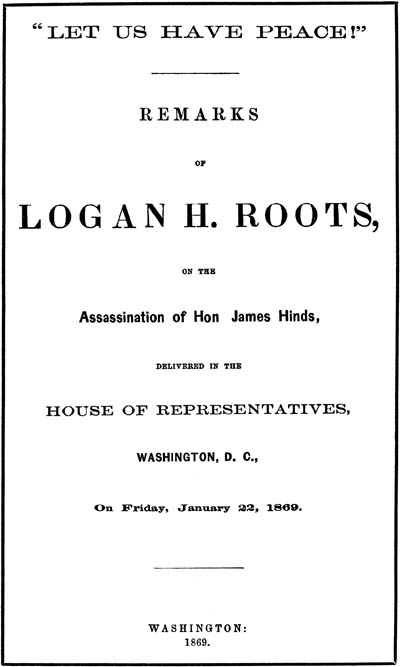 Oh! little did he think at that moment that ere the sunlight of that beautiful October day should give way to the cold dew of night his own soul would be driven from his body by the cold damp of death. He was traveling with Hon. Joseph Brooks, another tried and valiant soldier in the great cause of freedom and equal rights. They were to speak that day about six miles from the village of Indian Bay. They had been refused passage on a steamboat because they were Radicals, and so were belated. Some hundreds of eager, expectant Republicans were awaiting their arrival. To this meeting the officers of the Democratic club had gone as advocates of the adoption of “joint peace resolutions.” The Republicans said that several Radicals had then recently been killed in the county and no Democrats; and therefore they thought if the Democracy had suddenly acquired a desire for peace no resolutions were necessary; but although some of them thought it merely a cloak for Democratic villany, they were willing to bind themselves in resolutions to do what they intended doing anyhow, and they therefore unanimously adopted the resolutions. One of the principle signers and most apparently earnest advocates was George W. Clark, secretary of the Democratic club. But as soon as he had signed them he returned[8] to his home, arriving there before Messrs Brooks and Hinds had reached that far, and himself gave the fated ones direction as to the road. When they had ridden on he got his gun, saddled his horse, and rode after them. The intended victims were riding along with their greatest solicitude at the moment, being anxious though to reach the waiting crowd. The horses being differently gaited, Mr. Brooks was at the moment some fifty yards ahead. The man with grayish suit on rode up near, but a very little in the rear of Mr. Hinds, smiling as Judas may have smiled when he kissed his Lord and Master, he engaged in pleasant conversation. For a second the three thus rode on, the victims wholly unsuspecting, and the smiling murderer, with cold-blooded calculation, waiting for a better opportunity to make sure of both. An illustration of the meaning of Democratic peace resolutions is about to be made. The same hand which a few hours before signed peace resolutions now grasps the assassin’s weapon, within a very few feet of Mr. Hinds’ back, the gun is suddenly raised. Click, click, hear the triggers! Oh! the terrible instant! bang, bang, goes the gun. Mr. Brooks’s horse, stung with buck-shot, bounds ahead with a wounded rider, while the second horse madly leaps forward riderless, and James Hinds lies on the ground motionless, dying. Another order of the Ku-Klux-Klan has been executed; smiling with a fiend’s smile upon his features stands the Democratic assassin; the soul of another martyr is sent unshriven before the arbitrator of eternity; dying, shot[9] in the back, lies the Radical Congressman. Would to God the curtain of oblivion might drop over the scene forever!