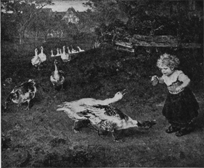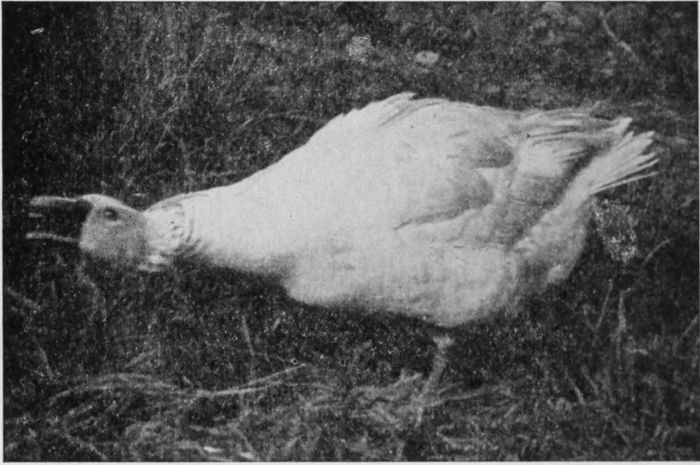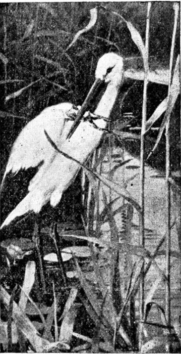 The stork spends the winter in Africa and flies back in the summer to Europe, where it is very common in Holland and North Germany. Its feeding place is in the marshes, where it wades[329] about, eating the frogs and other small animals to be found there. It is very fond of eels and will follow people about the streets who feed it on this favorite morsel. It has a way of asking for food by nodding its head, flapping its wings, and blowing the air from its lungs.