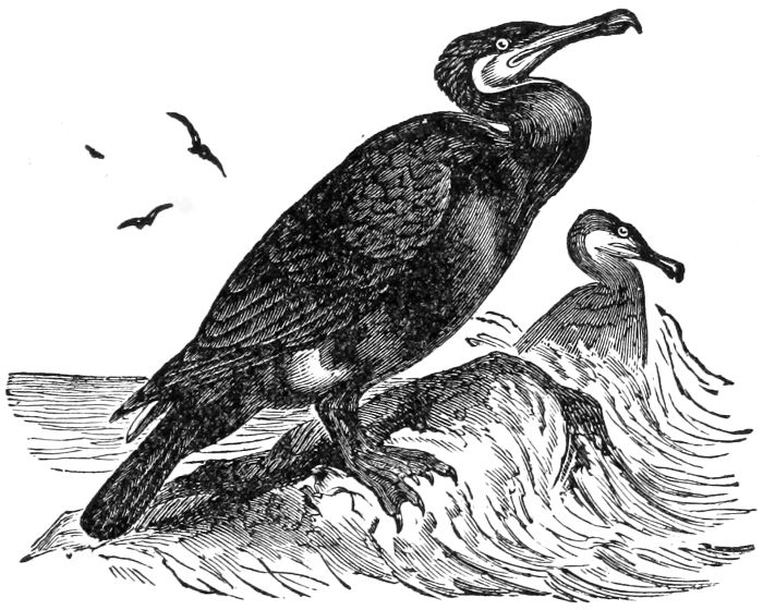 Now let us take up the story of the Cormorant,[331] one of the web-footed swimming and fishing birds, of which so many kinds dwell about the waters of the world. They belong to the same family as the pelicans, but while the pelican has a great net, or fish basket, under its lower bill, the cormorant has only a small one, not big enough to hold many fish.