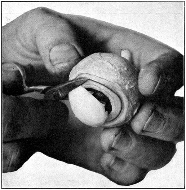 Still another way to see the interior is to cut out a piece of the sclerotic about the size of a twenty-five-cent piece; then pinch up and tear out the choroid and the retina under the opening made in the sclerotic. (Fig. 57.) Hold the eye, the cornea forward, close to a bright light, and the image of the light will be seen upon the retina. The closer the light is to the eye, the greater the illumination will be in the[111] interior of the eye. If the opening or “window” is close enough to the optic nerve, the optic papilla can be seen easily. And, if care has been taken to have the opening made midway between the two branches of the retinal artery, the entire course may be followed. The direction of the retinal artery can be determined by ophthalmoscopic examination.