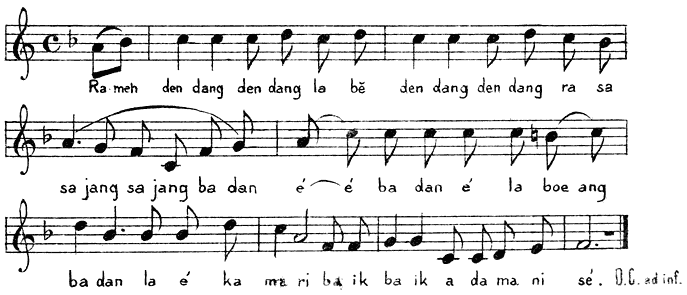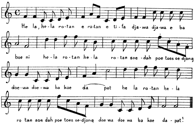 De Loehoeneezen echter, die de euveldaden van hun eigen heer moede werden, hielpen de onzen met het maken van eene nieuwe steenen versterking. Dit zal wel de vesting zijn waarop in het oude Séri Kambélo-lied gedoeld wordt, Lima teá lima, leé hatoe Laoe séri Kambélo, djadi kota Loehoe wélé, zeggende dat de mannen de steenen hand over hand doorgaven, van de kust [10]van Kambélo, tot die van Loehoe, alwaar de vesting tot stand kwam. Door de Loehoeneezen kwamen wij ook in het bezit van eenen brief, door radja Hamza aan den Kimelaha geschreven, waaruit ten duidelijkste bleek, dat hij den spot met ons dreef en dat hij niet het minste plan had om den sluikhandel in nagelen te beletten, zooals hij tegenover ons behoorde te doen.