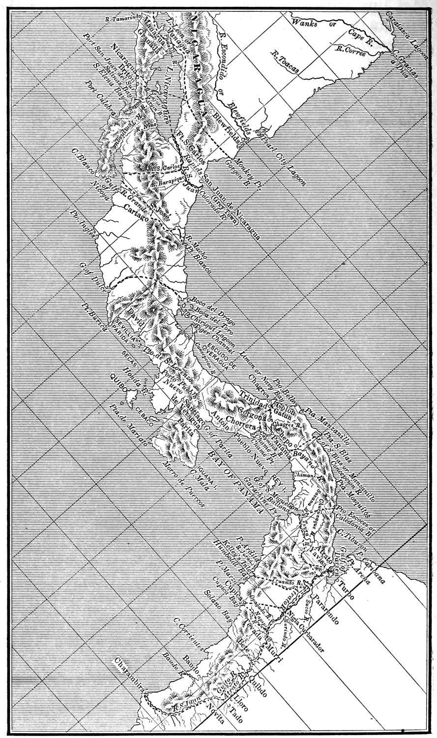 [XXXIV-8] For canal: I. Tehuantepec, connecting the rivers Coatzacoalcos and Chimilapa. II. Honduras. III. River San Juan de Nicaragua: 3. River San Cárlos, Gulf of Nicoya. Nicaragua Lake: 4. Rivers Niño and Tempisque, Gulf of Nicoya; 5. River Sapoa, Bay of Salinas; 6. San Juan del Sur; 7. Port Brito. Managua Lake: 8. River Tamarindo; 9. Port Realejo; 10. Bay of Fonseca. IV. Panamá: River Chagres: 11. Gorgona, Panamá; 12. Trinidad, Caimito; 13. Navy Bay, Rivers Chagres, Bonito and Bernardo; 14. Gulf of San Blas, and River Chepo. V. Darien: 15. Bay of Caledonia, Port Escocés, Gulf of San Miguel; 16. Rivers Arguia, Paya, and Tuyra, Gulf of San Miguel. River Atrato: 17. River Napipi, Bay of Cupica; 18. River Uruando, Kelley's Inlet. Overland. 1st. Coatzacoalcos, Tehuantepec; 2d. Bay of Honduras to Bay of Fonseca; 3d. River San Juan, Nicaragua, Managua, Bay of Fonseca; 4th. Port Limon to Caldera, Costa Rica; 5th. Laguna de Chiriquí on Golfo Dulce; 6th. Colon, Gorgona, and Panamá; 7th. Gorgon Bay, Realejo; 8th. Gorgon Bay and San Juan del Sur. Nouv. Annales des Voy., cliii. 9-10; Davis' Rept, 20.