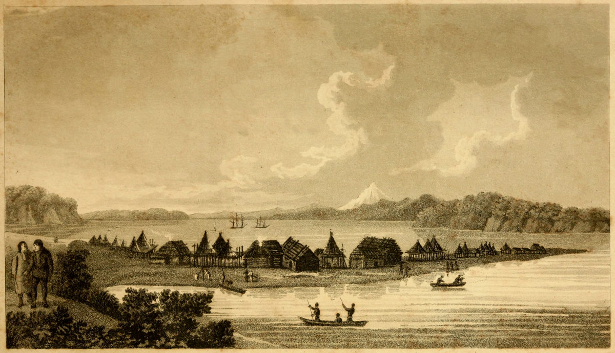 When this ceremony was over, Koah dined with Captain Cook, eating plentifully of what was set before him; but, like the rest of the inhabitants of the islands in these seas, could scarcely be prevailed on to taste a second time our wine or spirits. In the evening, Captain Cook, attended by Mr. Bayly and myself, accompanied him on shore. We landed at the beach, and were received by four men, who carried wands tipt with dogs’ hair, and marched before us, pronouncing with a loud voice a short sentence, in which we could only distinguish the word Orono.[2] The crowd, which had been collected on the shore, retired at our approach; and not a person was to be seen, except a few lying prostrate on the ground, near the huts of the adjoining village.