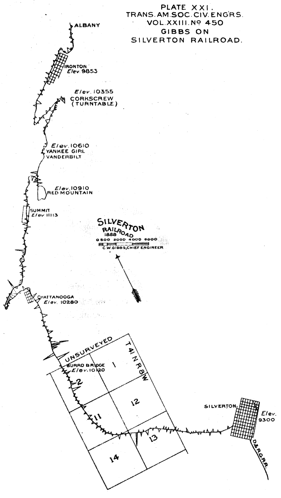 The 5.3 miles of railroad from Silverton to Burro Bridge must have been constructed in the summer of 1887 for it is known to have been in operation by the first of June of the next year. In 1888 Charles W. Gibbs, who had served under Mr. Wigglesworth on a number of projects, became the locating and construction engineer. He started late in May at Burro Bridge and in early November had completed 11.2 miles through Red Mountain and to Ironton. Only 11.2 miles in over five months! But anyone acquainted with the country is not surprised.