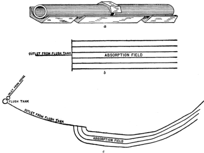 The method of subsurface irrigation just described may be too complex and too expensive where land is abundant and neighboring houses at some distance. The simpler method of surface irrigation may be resorted to by laying out at some distance—at least 100 feet—from the house a small sewage farm where the sewage may flow in shallow trenches over the surface and slowly sink into the ground. Such an irrigation field must have the same qualities demanded by subsurface irrigation. Its surface should have sufficient slope and the soil should be porous, not retentive. The liquid sewage, including kitchen and chamber slops, is conducted to this field in a water-tight tile drain and then allowed to flow into shallow trenches. To avoid the overloading of the soil with sewage at any one place the main distributing trench should be so arranged that it and the irrigating trenches branching from it may be temporarily blocked at any point to divert the sewage into one or more different trenches every day. In winter the warmth of the sewage will keep it in motion and the filtration will go on although the field may be covered with snow and ice. The use of the flush tank as described above would cause a more uniform distribution of the fluid over the field and make the filtration distinctly intermittent. The ground between the trenches may be cultivated to increase the amount of evaporation. If conveniently situated, an orchard may be used as the irrigation field. It should be distinctly understood, however, that marketable fruits and vegetables should not be carelessly allowed to come in contact with fresh sewage, nor should the irrigation field be near the well unless the latter is fairly deep and tubed or tiled to the surface of the water.