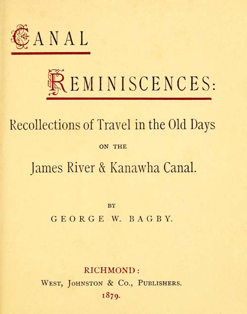 But shall we see better times? Why, yes, surely. They have begun already in Troy, N. Y., the papers say. And I verily believe the railway, which is to take the place of the canal, will do more than all things else to bring back work for all and money for all of us in our fair city of Richmond. Let us at least hope so. And with that hope in view, I trust that these reminiscences of an obsolescent mode of travel—which may have been delightful, but certainly was not rapid—will give a few moments of pleasure to the friends of the publishers and of the writer.