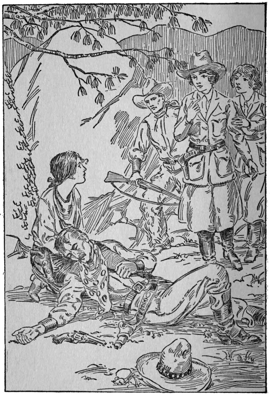 “Give ’em the rifles!” yells Two-gun Pete. The end of the battle. An Overlander is found seriously wounded. Tom bears bad news to his companions. Elfreda gives first aid. Cowpunchers look on in open-mouthed wonder.