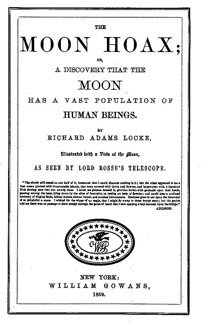 Among this class of extraordinary fictitious narratives and supposed discovery, may be placed the renowned Moon Hoax, by Richard Adams Locke. When it first made its appearance from day to day in one of the morning papers, the interest in the discovery was intense, so much so that the circulation of the paper augmented five fold, and in fact, was the means of giving the journal a permanent footing as a daily newspaper. Nor did this multiplied circulation of the paper satisfy the public appetite. The proprietors of the journal had an edition of 60,000 published in pamphlet form, which were sold off in less than one month; and of late this pamphlet edition has become so scarce that a single copy was lately sold at the sale of Mr. Haswell's Library for $3.75.