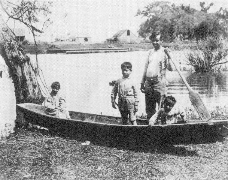 Chitimacha Chief Benjamin Paul and the Chitimacha children are pictured with a pirogue near the Chitimacha reservation in Charenton. The little girl is Jane Bernard Wilson, the boy in the center is Arthur Darden, and the boy sitting in the pirogue is Gabriel Darden.