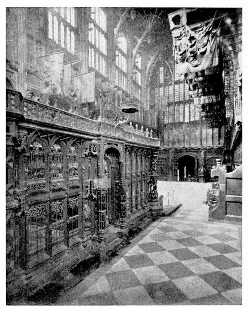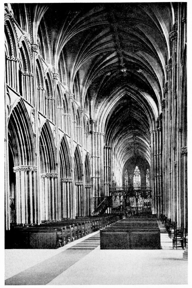 “As we see our cathedrals now, the view that meets us differs much from that which would have greeted us in mediæval times. Then all was ablaze with colours. Through the beautiful ancient glass the light gleamed on tints of gorgeous hues, and rich tapestries and hangings, on walls bedight with paintings, and every monument, pier and capital were aglow with coloured decorations. We have lost much, but still much remains. At the Reformation the avaricious courtiers of Henry VIII. plundered our sacred shrines, and carried off under the plea of banishing superstition vast stores of costly plate and jewels, tapestry and hangings. In the Civil War time riotous, fanatical soldiers wrought havoc everywhere, hacking beautifully-carved tombs and canopies, destroying brasses, and mutilating all that they could find. Ages of neglect have also left their marks upon our churches; and above all the hand of the ignorant and injudicious ‘restorer’ has fallen heavily on these legacies of Gothic art, destroying much that was of singular beauty, and replacing it by the miserable productions of early Nineteenth Century fabrication.”—(P. H. D.)