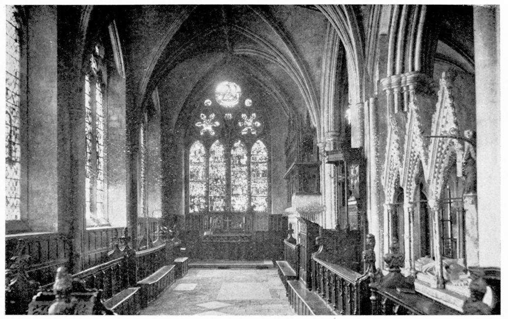 Behind, or east of the choir, is situated the Lady-Chapel, or Chapel of the Virgin, which sometimes{viii} contained additional altars to other saints. Along the aisles we frequently find side chapels, containing tombs and chantries of dignitaries, local saints and benefactors.