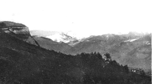 A regret j'ouvre les yeux encore éblouis par la vision de la magie estivale. Aujourd'hui, c'est un après-midi d'automne à son début, une légère brume tamise les rayons du soleil. Et tandis que le train s'élève au-dessus de la plaine des Fins, qui prolonge celle d'Annecy vers La Roche-sur-Foron, je regarde surgir peu à peu dans les lointains voilés [Pg 15] d'une buée violacée les cimes immatérielles des montagnes amies de cette Savoie si bien décrite par P. Guiton dans son livre: «Au cœur de la Savoie» [1].